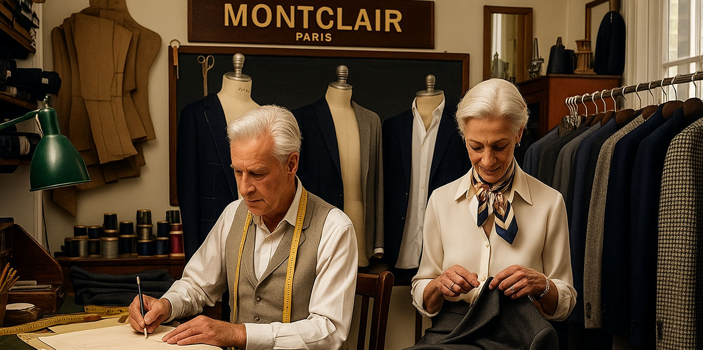 Bonjour ! Nous sommes Henry et Margot Montclair. Depuis plus de 55 ans, nous nous consacrons corps et âme à la confection de vêtements de luxe pour hommes. Chaque costume raconte une histoire : la nôtre, celle de nos familles, et celles de tous ceux qui chérissent l'authenticité et la tradition.